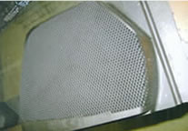 •  蜂の巣のように細かい六角形の穴が無数に並ぶスピーカーのグラファイト電極。